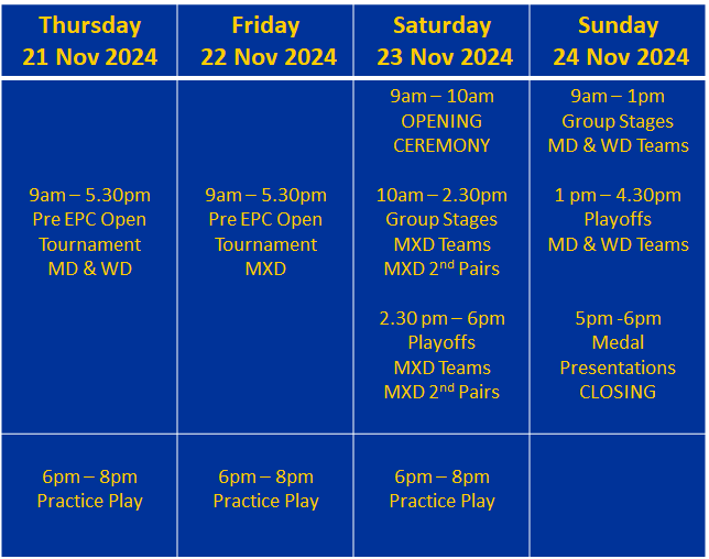Events: Women’s Doubles, Men’s Doubles, Mixed Doubles